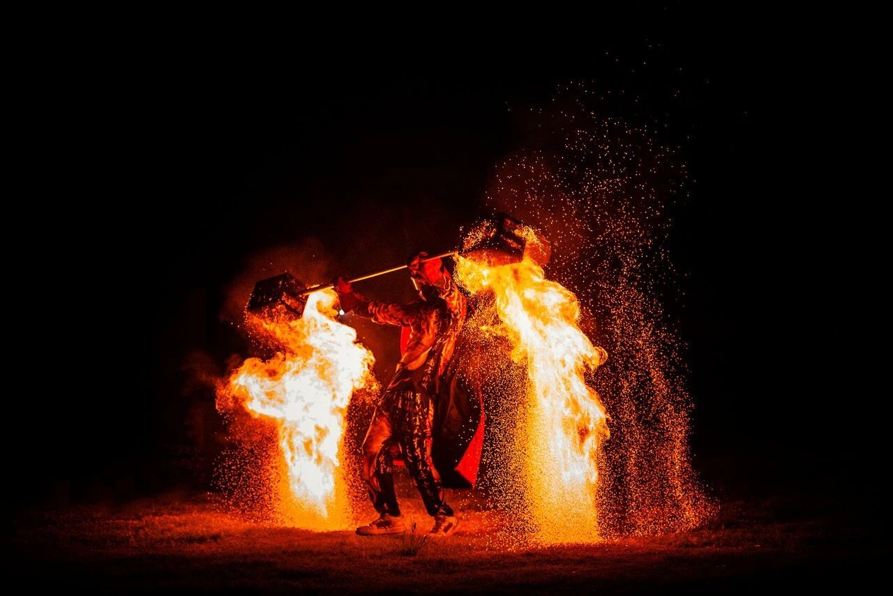 “我们想通过火的不同形态,展现力量、优雅与祝福。”演出策划人介绍。空中飞人如灵鸟般灵动,火舞者手持火棍旋转跳跃,火焰在夜空中划出绚烂轨迹。