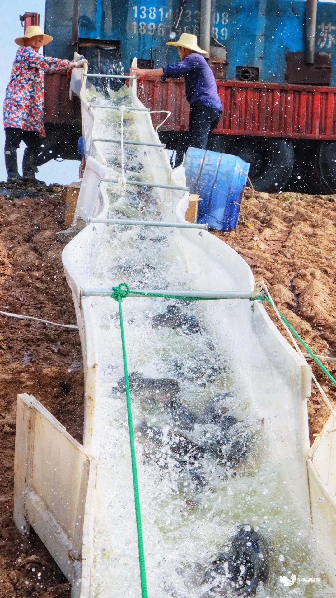 近日,记者在东西湖万亩现代渔业保供基地看到,一台装载有保温鱼箱的活鱼运输车停放在一处70亩鱼塘前,工作人员正在对箱内的活鱼进行捞网称重,完成称重确认后,活鱼又被放入箱内,随后工作人员打开鱼箱右边的“小门”,放出管道连接铺设在鱼塘前的“滑滑梯”,随着工作人员打开鱼箱最后一道闸门,瞬间无数条小鱼乘坐“滑滑梯”直达鱼塘。