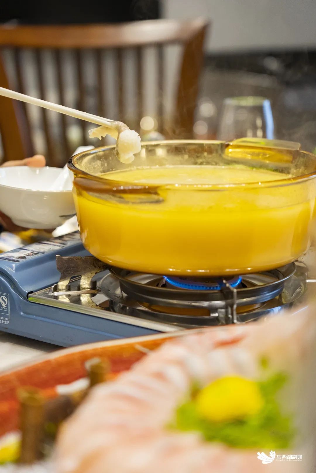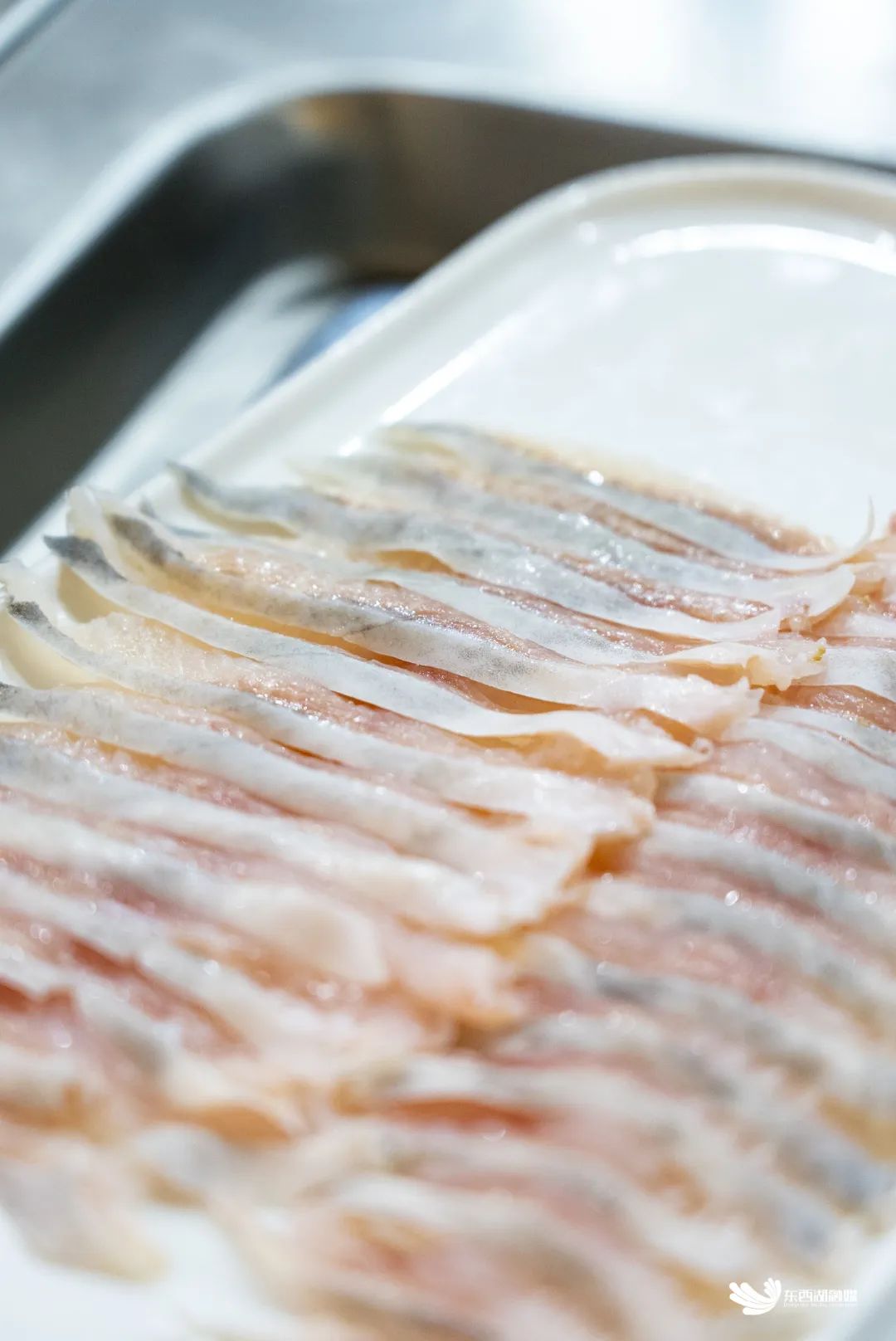 生态鲜活的鮰鱼,片成薄如蝉翼2mm薄片,这极其考验厨师的刀工。老母鸡、老水鸭、筒子骨、火腿等食材精心熬制6小时顶级原味高汤,风味尽收,咕嘟咕嘟冒着热气,夹一鱼片涮上7、8秒,吸满味鲜且浓稠的翅汤,鱼肉抿一抿就化在嘴尖、鲜掉眉毛,真是听了头!