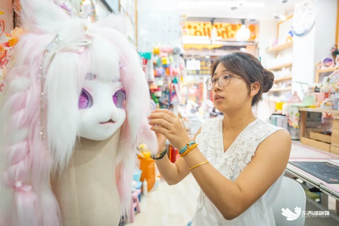 今年兽头制作在年轻群体中蔓延。与传统手工不同,兽头(Fursuit Head)是兽迷文化(Furry Fandom)的核心载体,强调高度个性化的角色设定。女生偏好“狐系”追求灵动媚眼与华丽妆面,男生青睐“狗系”侧重憨萌神态与力量感结构,每位爱好者都创造独一无二的“原创角色”。