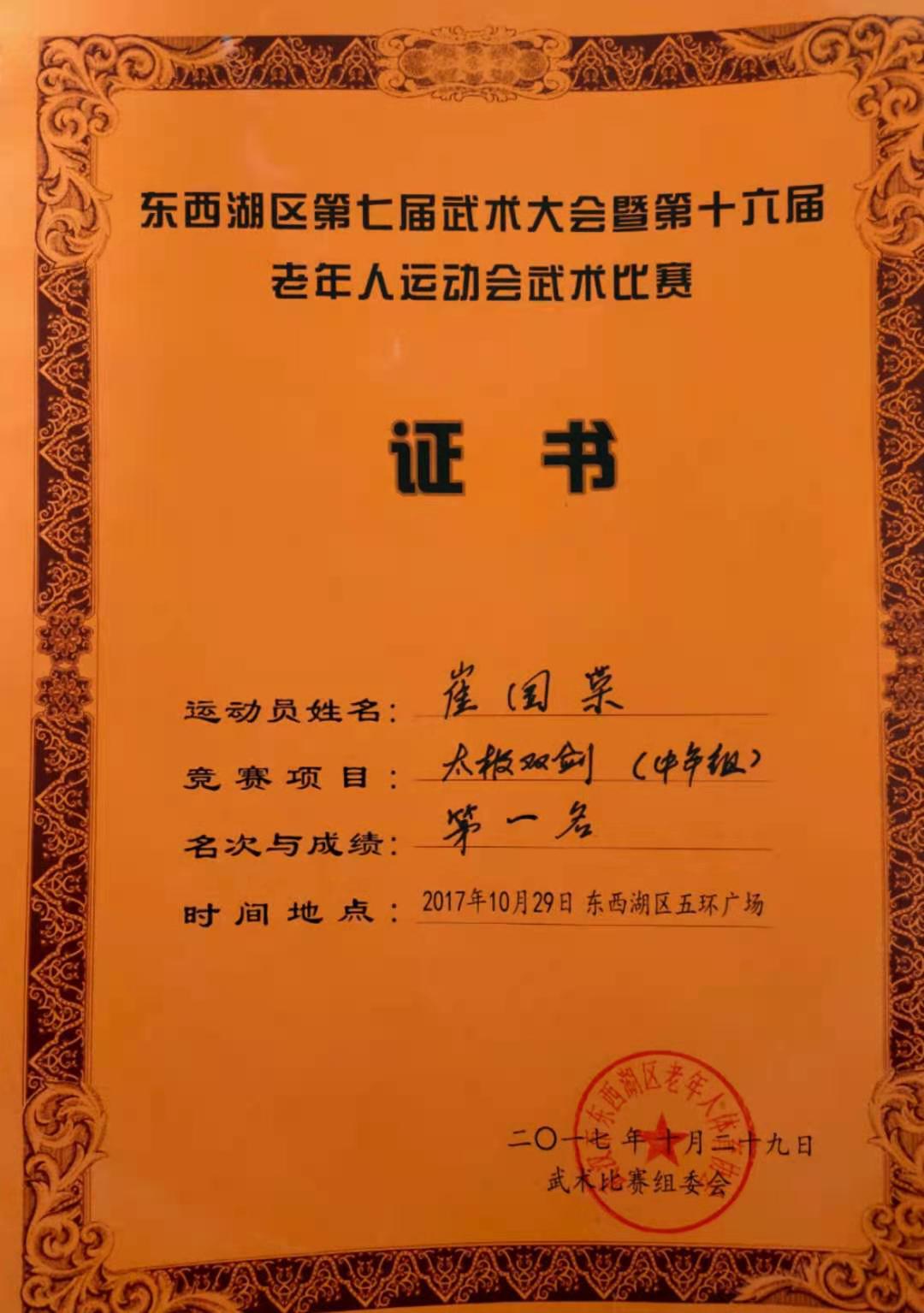 每天默默帮助何老师辅导新学员的徒弟还有东北人崔国荣,何老师称之为“老崔”。何老师说,看过很多人打拳,觉得她的手眼身法,基本功都还不错,一般人动作爱走样,都没有她打得好。四年来,崔国荣老师保持顽强的毅力跟着何老师学习了陈氏太极拳、杨氏太极拳、武当太极拳、三丰太极拳、游龙拳、八卦掌、武当太极剑、八卦剑、蛇形剑等。崔老师练拳以健身为主,很少去参加老年人武术比赛,2017年曾在东西湖区第七届武术大会暨老年人武术运动会比赛获太极双剑一等奖。