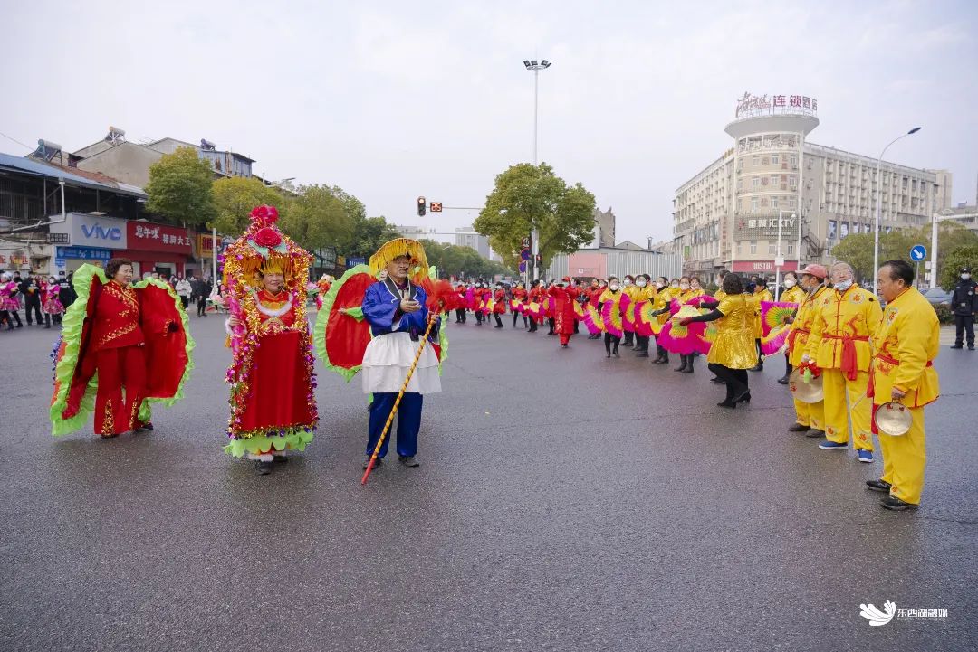 柏泉街新苑社区民俗活动现场,五颜六色的舞龙彩带变换花样,四向盘旋,让人眼花缭乱。