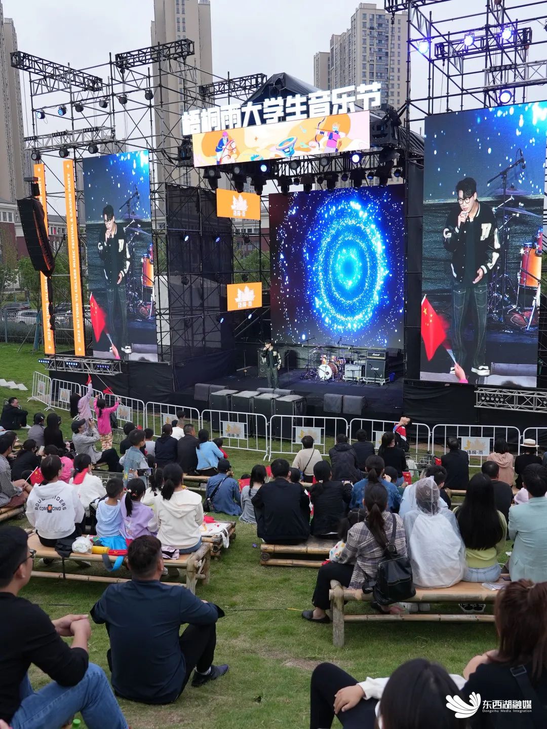 露天放歌,自然舞台,草坡是天然席位,数百位观众席地而坐,起伏的梧桐、花海绘成天然背景。