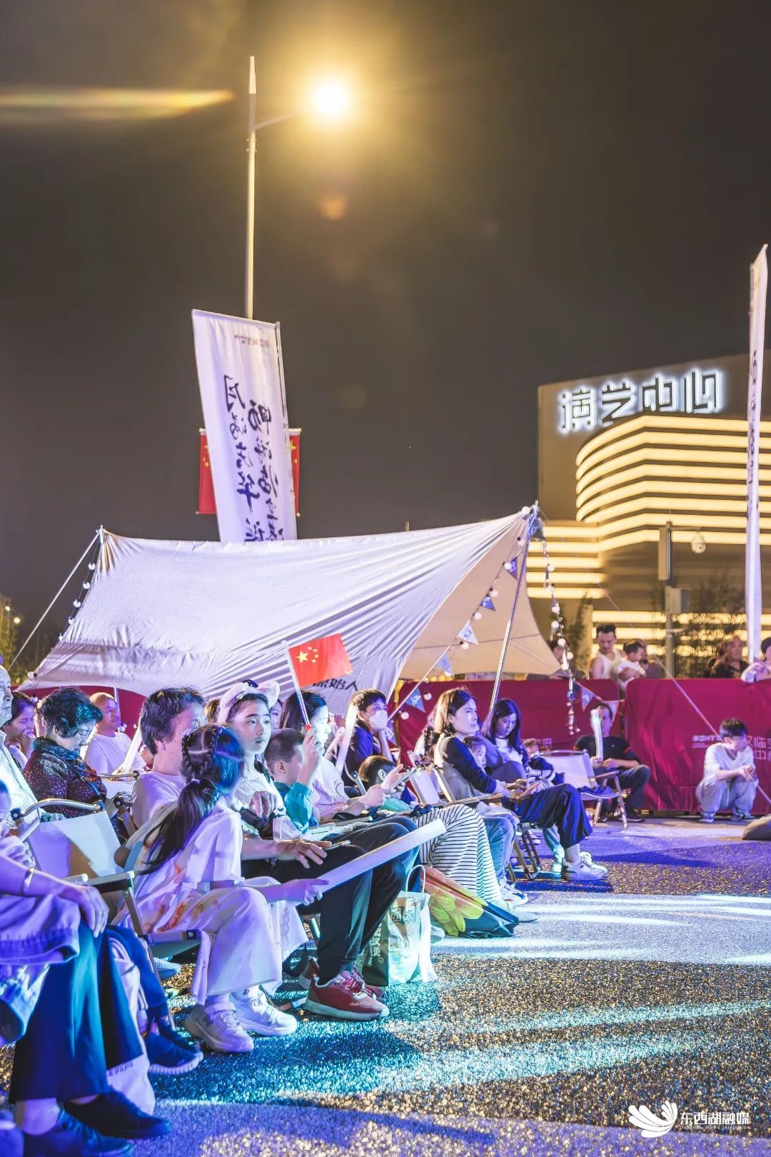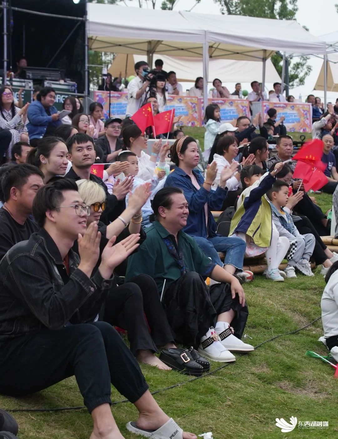 歌手轮番献唱,现场座无虚席。众多游客或在座椅、或在帐篷,一边享受美食,一边享受音乐。年轻人、老年人都手持荧光棒,挥舞着国旗。还有小朋友坐在长辈的肩膀上,兴奋地手舞足蹈。