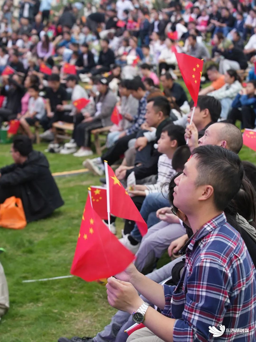 当落日余晖渐渐拉长,现场氛围却愈发火热。在城市高楼之侧,与自然相拥。唱响青春,不负热爱!红旗翻浪,全场呐喊!现场观众的热情与活力被点燃,大家纷纷舞动国旗,举起手机齐齐挥舞欢呼。