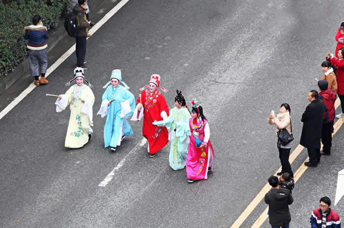 几个参加踏街活动的戏曲演员吸引路人目光 李冰 摄