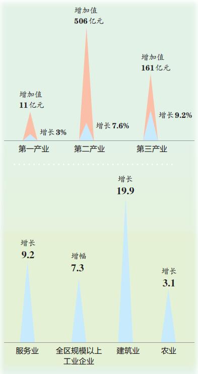 (柱状图表:第一产业实现增加值11亿元,增长3%;第二产业实现增加值506亿元,增长7.6%;第三产业实现增加值161亿元,增长9.2%。)