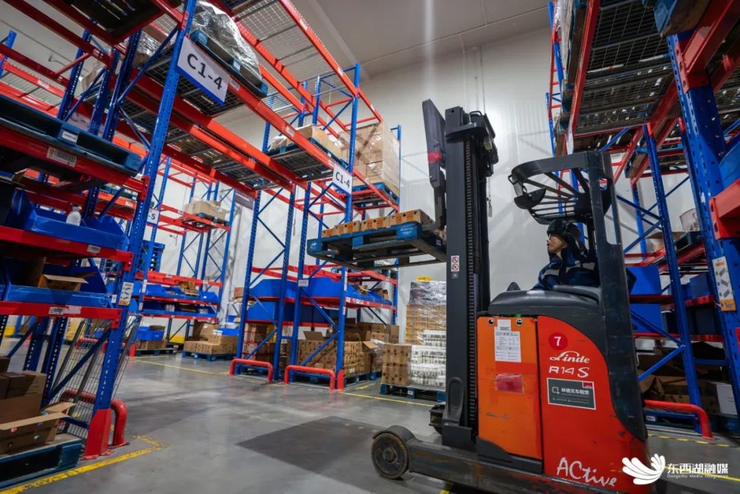 叉车司机正在冷库内调配货物。