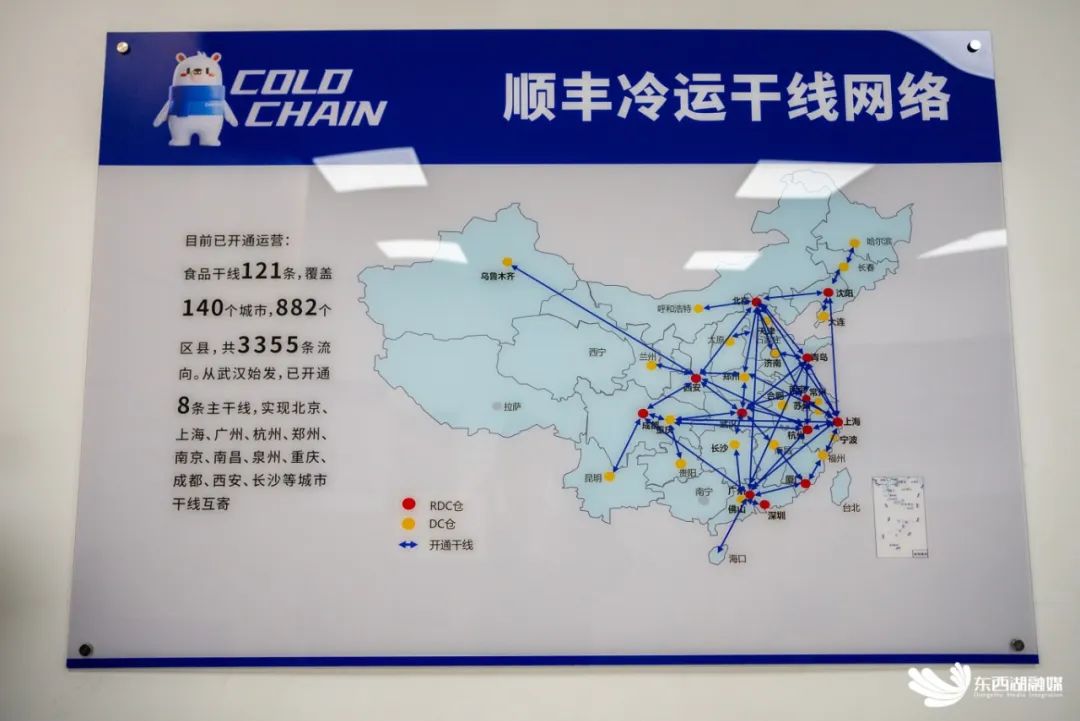 在办公区,墙上张贴着一张顺丰冷运干线网络示意图。记者注意到,武汉处在干线布局的中心位置,从武汉始发,顺丰冷运已开通8条主干线,实现北京、上海、广州、杭州、郑州、南京、南昌、泉州、重庆、成都、西安、长沙等城市干线互寄。