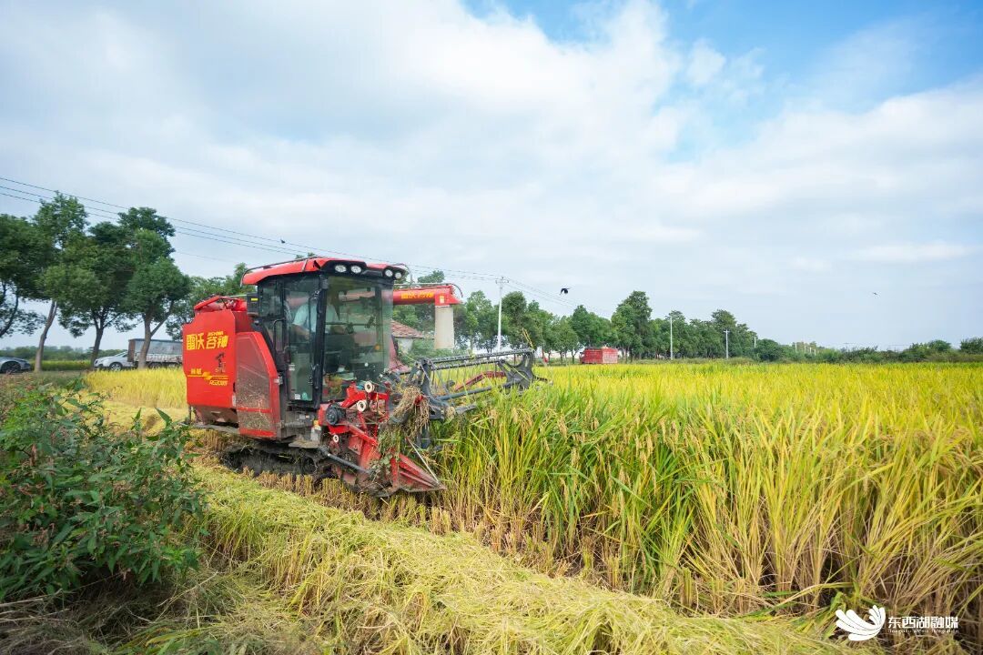 在吴张路沿线的农田里,一台沃得牌收割机正开足马力穿梭作业。黄绿色的稻浪被精准地切割出一道道整齐的直线,稻谷在机体内被迅速完成收割、脱粒等工序。不到10分钟,谷箱便已满满当当。