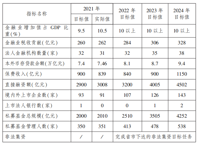 1.总体目标。到2024年,围绕服务实体经济、防控金融风险、深化金融改革三大任务,进一步增强各区、各部门和单位的金融意识;建强金融工作干部队伍,充实金融工作力量,提高金融工作水平;加大金融招商引资力度,不断丰富金融业态和市场主体;力争完成各项金融指标,推动金融市场规模再上台阶。