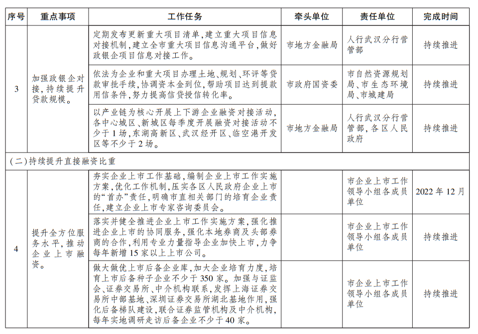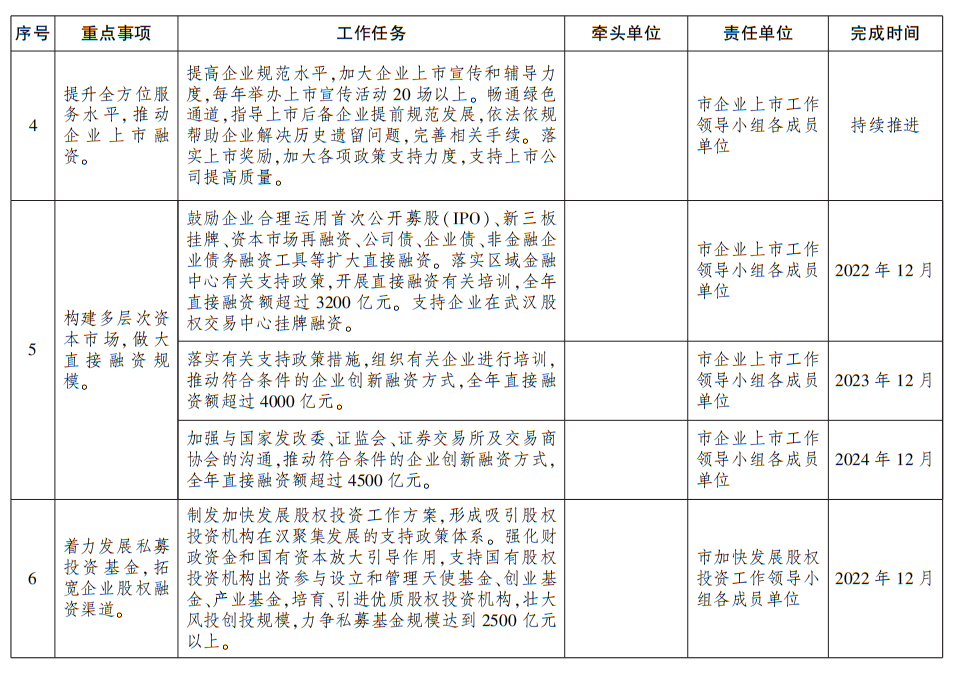 1.提升全方位服务水平,推动企业上市融资。夯实企业上市工作基础,强化企业上市责任共同体意识,加强上市工作力量,建立企业上市专家咨询委员会。做大做优企业上市后备资源库,加强与证监会、证券交易所、中介机构联系,发挥上海证券交易所中部基地、深圳证券交易所湖北基地作用,强化上市后备梯队建设。提高企业规范水平,加强企业上市宣传和辅导,畅通“绿色通道”。落实上市奖励政策,支持上市公司提高质量。
