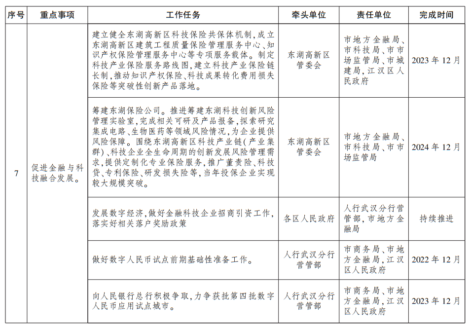 1.促进金融与科技融合发展。推动东湖高新区申报创建国家科创金融改革试验区,筹备设立光谷银行。推广科技信贷创新产品,持续扩大试点银行“投贷联动”规模。加快东湖科技保险创新示范区建设,筹建东湖保险公司,推进东湖科技保险创新发展促进中心实体运作,加快东湖科技创新风险管理实验室、信息综合服务平台建设,推动知识产权保险、科技成果转化费用损失保险等突破性创新产品落地。发展数字经济,积极引进、设立金融科技企业,推动我市获批数字人民币应用试点城市。争取在武汉股权托管交易中心开展创新试点,探索设立二手基金。优化武汉市企业融资对接平台(以下简称“汉融通”)功能,上线创业担保贷款等创新专区,与行业主管部门联合建设特色专区。