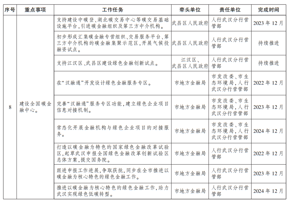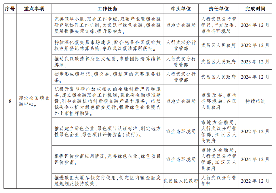 2.建设全国碳金融中心。建立健全武汉市碳金融发展组织体系。持续深化碳交易市场建设,配合完善全国碳排放权注册登记结算系统,推动成立武汉碳清算所。积极开发与碳排放权相关的金融创新产品和服务。推动建立绿色企业、绿色项目认证标准。加快培育各类碳金融组织,引进和发展碳资产管理、碳信用评级、碳核算核查等中介服务机构。支持武昌区打造碳金融集聚示范区、开展气候投融资试点,支持江汉区、武昌区建设绿色金融创新试点。推进“汉融通”设立绿色金融服务专区。在全市绿色低碳循环发展中充分发挥金融服务功能,打造以碳金融为特色的国家绿色金融改革试验区。
