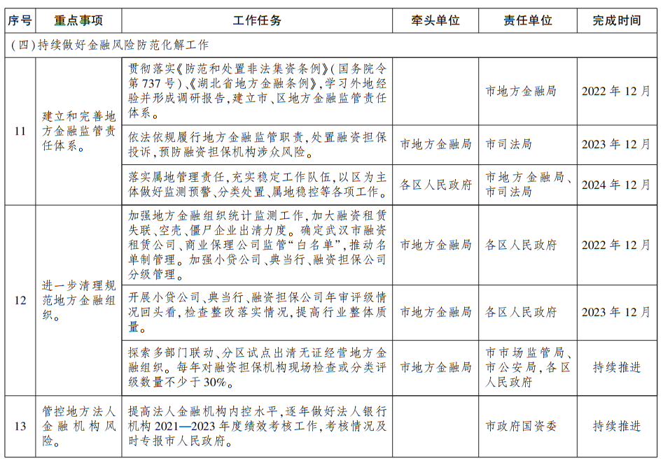1.建立和完善地方金融监管责任体系。贯彻落实《防范和处置非法集资条例》(国务院令第73号)、《湖北省地方金融条例》,建立市、区地方金融监管责任体系,依法依规履行地方金融监管职责。充实稳定工作队伍,以区为主体做好监测预警、分类处置、属地稳控等各项工作。