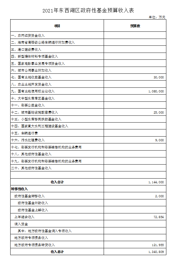 2021年东西湖区政府性基金预算收入表