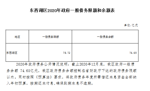 东西湖区2020年政府一般债务限额和余额表