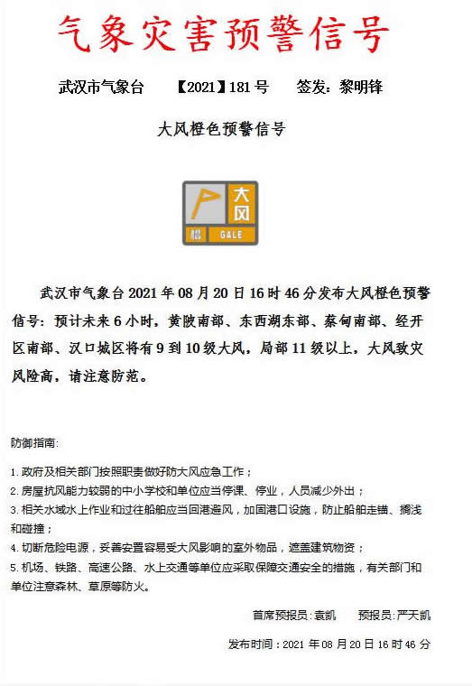 武汉市气象台气象灾害预警信号【2021】181号
