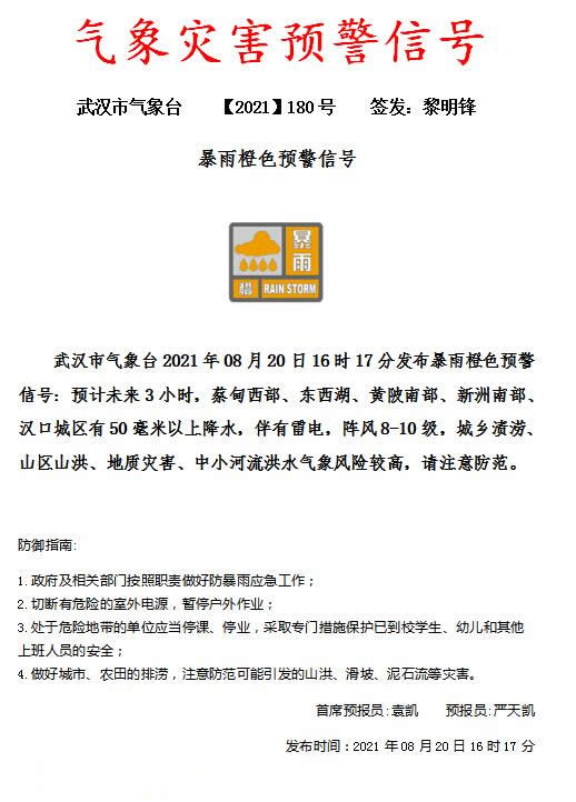 武汉市气象台气象灾害预警信号【2021】180号
