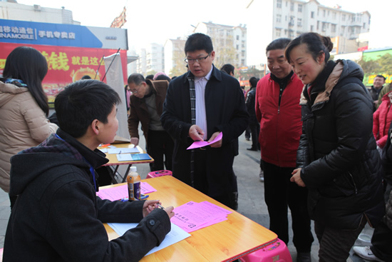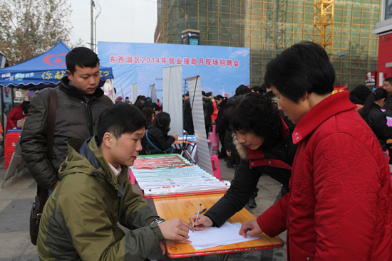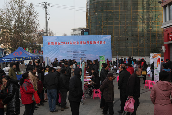 1月16日,区人力资源和社会保障局、区残疾人联合会和吴家山街办联合在北冰洋城市广场门前举办“东西湖区2014就业援助月现场招聘会”。