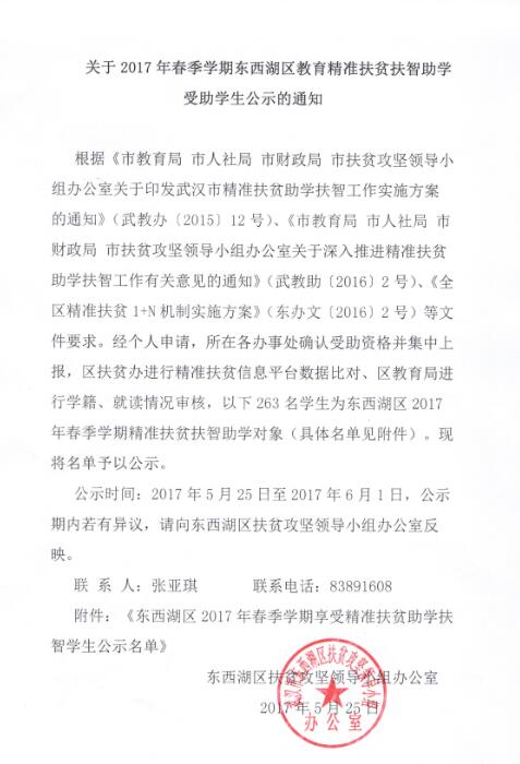 根据《市教育局 市人社局 市财政局 市扶贫攻坚领导小组办公室关于印发武汉市精准扶贫助学扶智工作实施方案的通知》(武教办〔2015〕12号)、《市教育局 市人社局 市财政局 市扶贫攻坚领导小组办公室关于深入推进精准扶贫助学扶智工作有关意见的通知》(武教助〔2016〕2号)、《全区精准扶贫1+N机制实施方案》(东办文〔2016〕2号)等文件要求。经个人申请,所在各办事处确认受助资格并集中上报,区扶贫办进行精准扶贫信息平台数据比对、区教育局进行学籍、就读情况审核,以下263名学生为东西湖区2017年春季学期精准扶贫扶智助学对象(具体名单见附件)。现将名单予以公示。