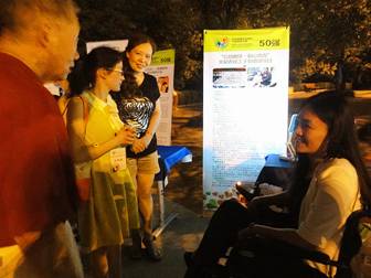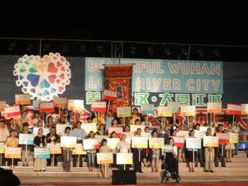 下午四点,空间工作人员及大学生志愿者提前来到江滩大舞台,签到后就开始布置展位,并开始发放宣传单,播放录音广播稿、向来往的群众宣传空间的公益助学项目。到七点整,拉票晚会正式开始,空间项目负责人刘聘上台与观众见面。紧接着是各社会组织的文艺节目演出。整个活动的代言人董明还专程到我们的展位前来和我们工作人员合影。