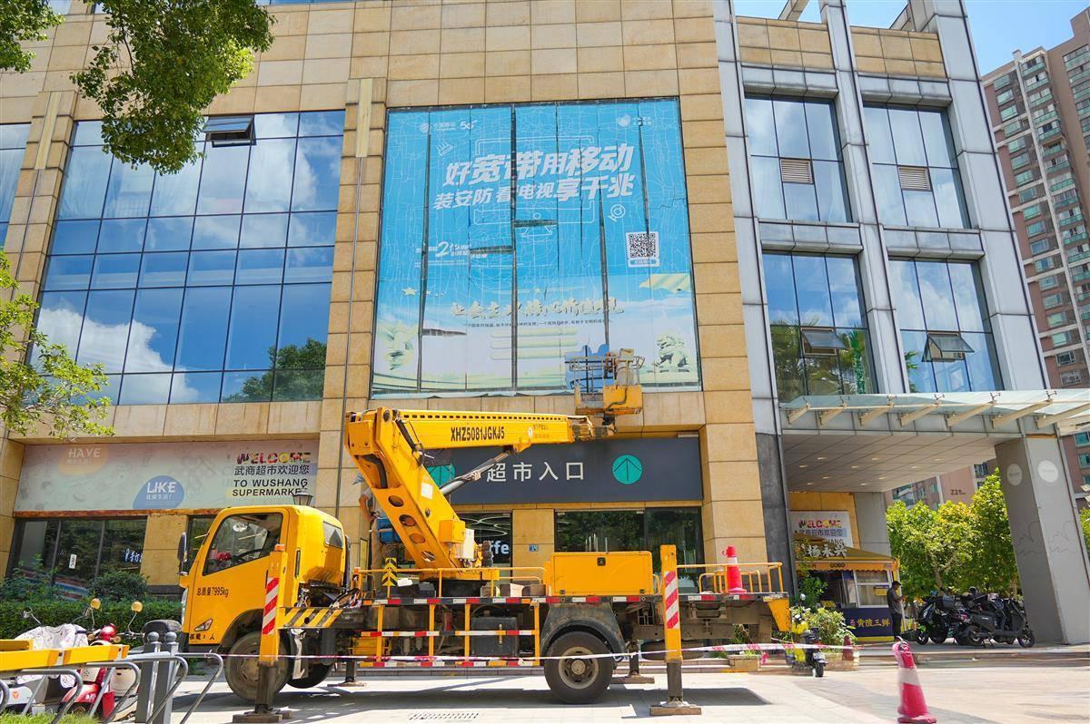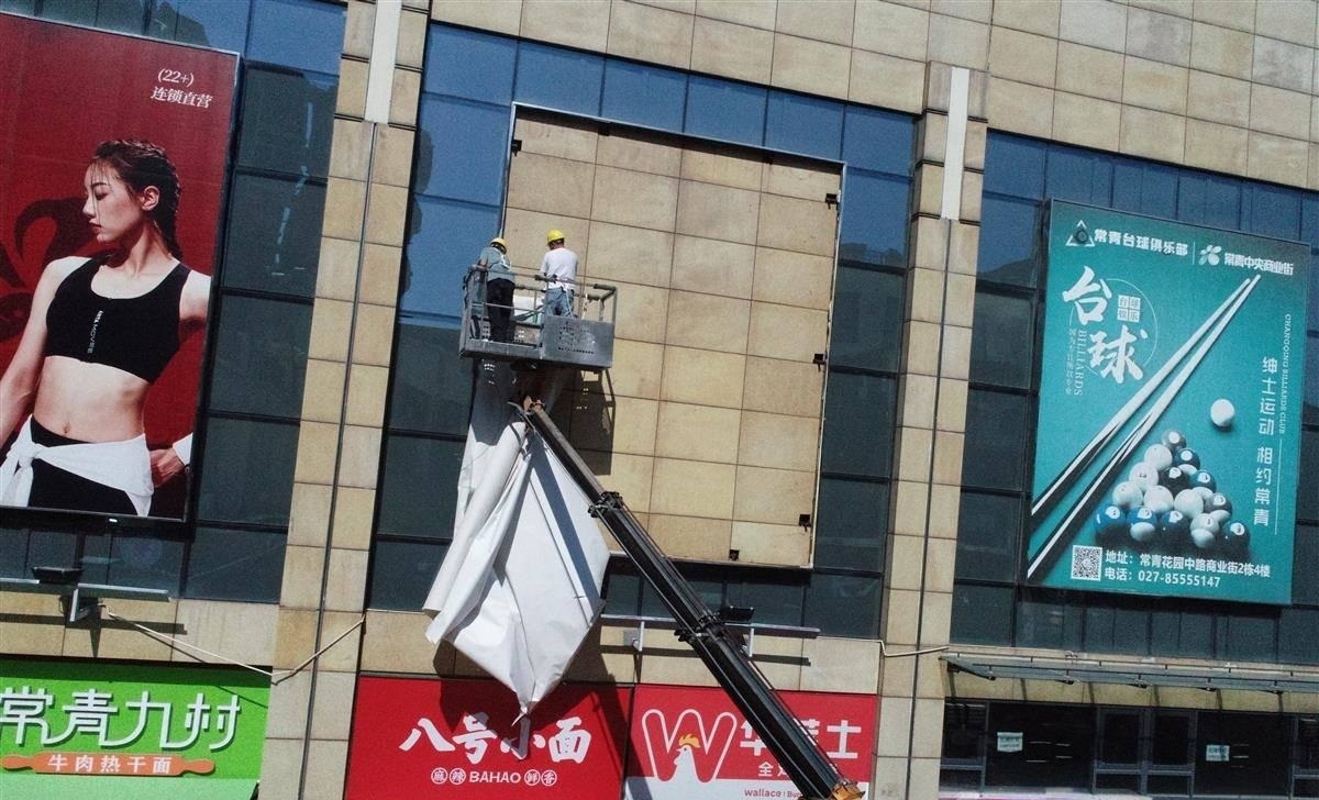 “存在安全隐患的广告,坚决依法拆除,绝不姑息!”8月19日上午,在常青花园中央商业街武商量贩门前,东西湖区城管执法局市政科相关负责人介绍说。在现场,施工人员正搭乘高空作业车,对武商量贩店外立面的问题广告进行一一拆除。
