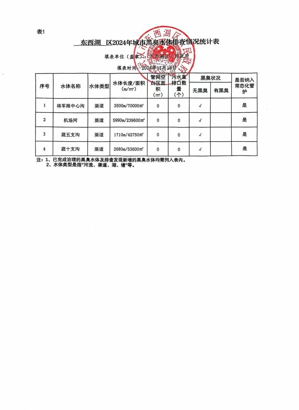 东西湖区2024年城市黑臭水体排查情况统计表公示