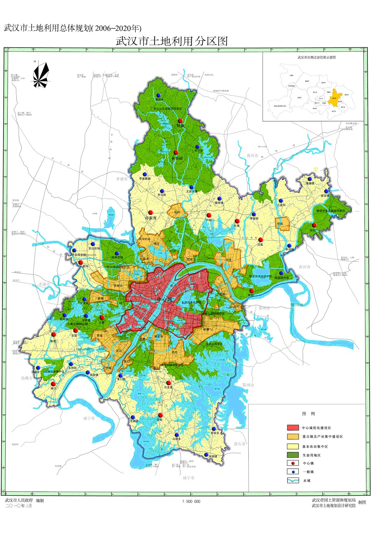 为加强中心城区土地利用控制,以不打破乡镇行政界限、保证中心城区功能的相对完整性和独立性为原则,划定中心城区规划控制范围,包括江岸区、江汉区、硚口区、武昌区、青山区全部区域,汉阳区、洪山区大部分区域和东西湖区、江夏区、蔡甸区、黄陂区部分区域,同中心城优化建设区范围保持一致,土地面积66000公顷。