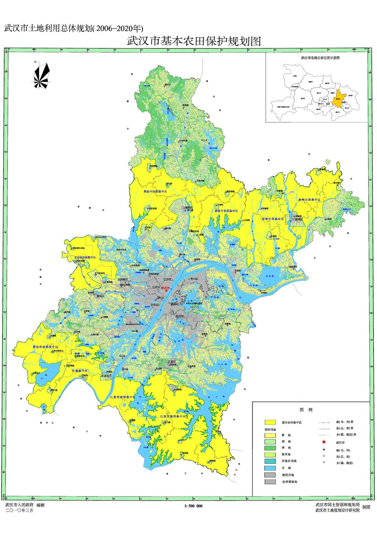(二)合理划定基本农田保护区。根据国土资源部会同农业部制定的技术规程,在不改变土地承包者的承包经营权的前提下,划定新洲区中部、黄陂区中部、江夏区南部、蔡甸区西南部、汉南区中西部等粮棉油生产基地内的耕地,东西湖区、新洲区等蔬菜瓜果生产基地、农业科研和教学试验田为基本农田保护区。