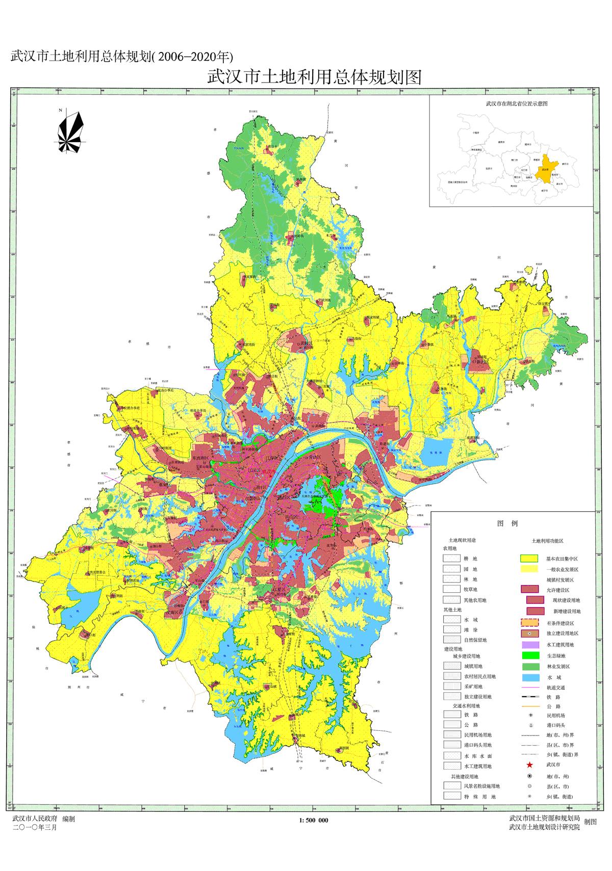 《规划》立足于武汉市土地资源供需状况和未来15年经济社会发展形势,确定全市2006~2020年土地利用主要目标和控制指标,统筹安排各类各业各地区用地,优化土地利用空间布局,明确耕地和基本农田保护、建设用地节约集约利用、土地利用生态建设和环境保护、中心城区土地利用的管控要求,布局和安排土地整治工程和重点建设项目,提出统筹区域土地利用的调控政策和规划实施的保障措施。《规划》以2005年为基期年, 2006~2020年为规划期,2010年为近期目标年,2020年为远期目标年。