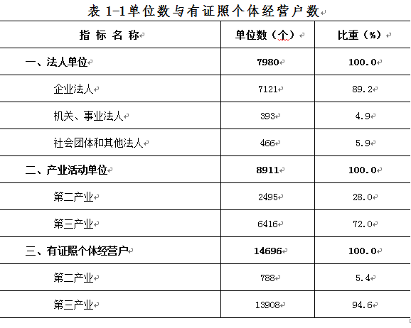 2013年末,全区共有从事第二产业和第三产业活动的法人单位 7980个,比2008年末(2008年是第二次全国经济普查年份,下同)增加3229个,增长68.0%;产业活动单位8911个,增加4046个,增长了83.2%;个体经营户25919个,增长23.4%,其中,有证照个体经营户14696个(详见表1-1)。