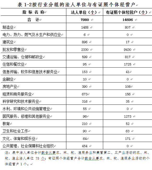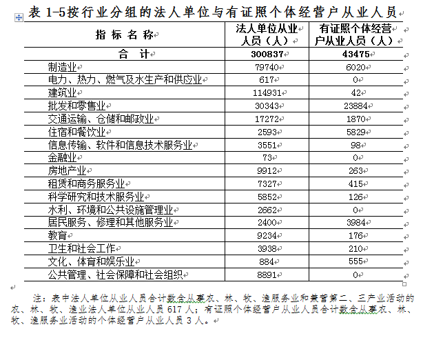 在法人单位从业人员中,位居前三位的行业是:建筑业114931人,占38.2%;制造业79740人,占26.5%;批发和零售业30343人,占10.1%。在有证照个体经营户从业人员中,位居前三位的行业是:批发和零售业23884人,占54.9%;制造业6020人,占13.8%;住宿和餐饮业5829人,占13.4%(详见表1-5)。