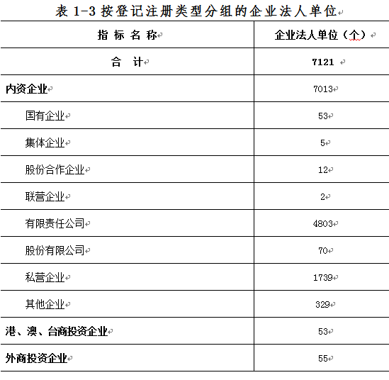 2013年末,全区共有第二产业和第三产业的企业法人单位 7121个,比2008年末增加2370个,增长49.9%。其中,内资企业7013个,占98.5%;港、澳、台商投资企53个,占0.7%;外商投资企业55个,占0.8 %。内资企业中,有限责任公司企业4803个,占全部企业法人单位的67.4%;私营企业1739个,占24.4%(详见表1-3)。