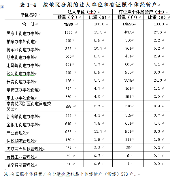 2013年末,全区第二、三产业法人单位数居前三位的街道办事处(管理处)依次是:吴家山街道办事处1223个,占全区法人单位15.3 %;产业管理处933个,占11.7%;将军路街道办事处853个,占10.7 %。全区第二、三产业有证照个体经营户数居前三位的街道办事处(管理处)依次是吴家山街道办事处4063个,占全区有证照个体经营户27.6 %;长青街道办事处3578个,占24.3 %;径河街道办事处933个,占6.3 %(详见表1-4)。