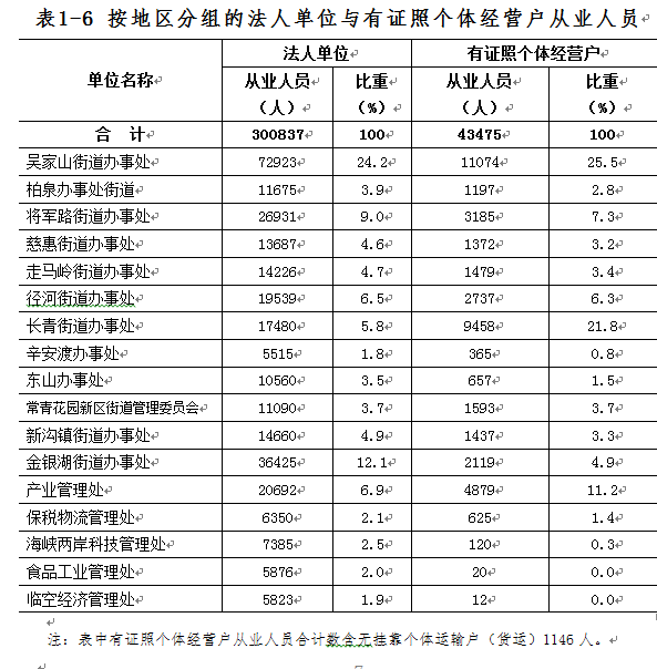 2013年末,全区第二、三产业法人单位从业人员居前三位的街道办事处(管理处)依次是:吴家山街道办事处72923人,占全区法人单位从业人员的24.2%;金银湖街道办事处36425人,占12.1%;将军路街道办事处26931人,占9.0%。全区第二、三产业有证照个体户从业人员居前三位的街道办事处(管理处)依次是:吴家山街道办事处11074人,占全区有证照个体户从业人员25.5%;长青街道办事处9458人,占21.8%;产业管理处4879人,占11.2%(详见表1-6)。
