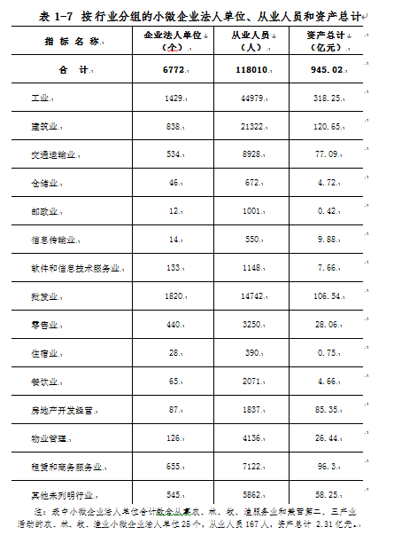 小微企业从业人员118010人,占全部企业法人单位从业人员42.6%。其中,位居前三位的行业是:工业44979人,占全部企业法人单位从业人员16.2%;建筑业21322人,占7.7%;批发业14742人,占5.3%。