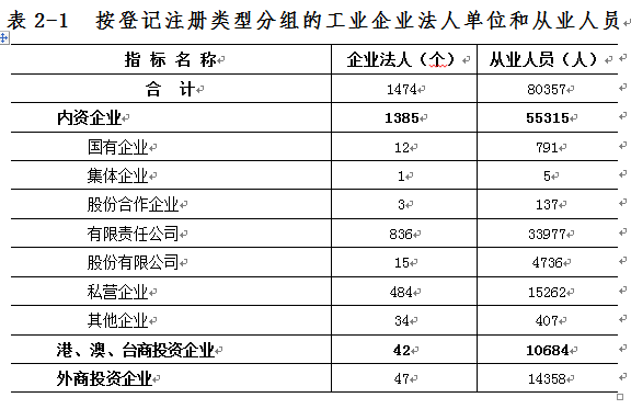 在工业企业法人单位中,内资企业1385个,占94.0%;港、澳、台商投资企业42个,占2.8%;外商投资企业47个,占3.2%。