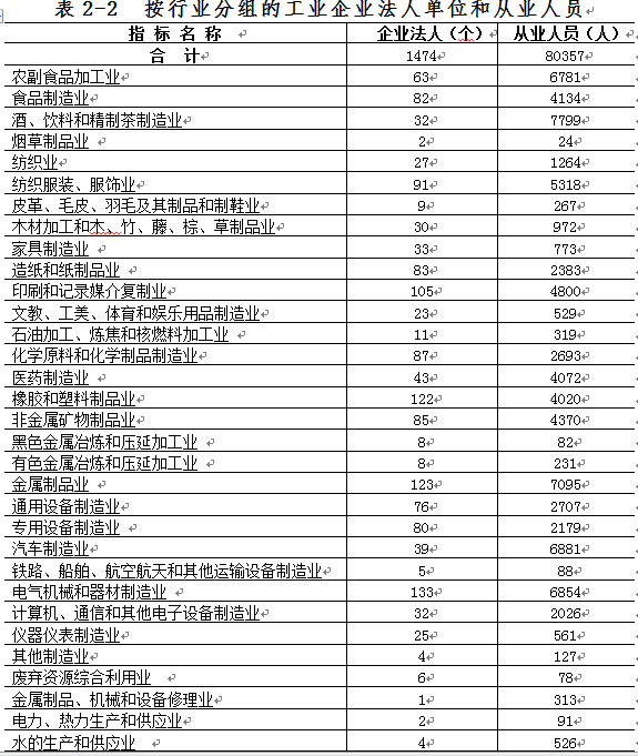 在工业企业法人单位中,制造业1468个,电力、热力、燃气及水生产和供应业6个,分别占99.6%、0.4%。