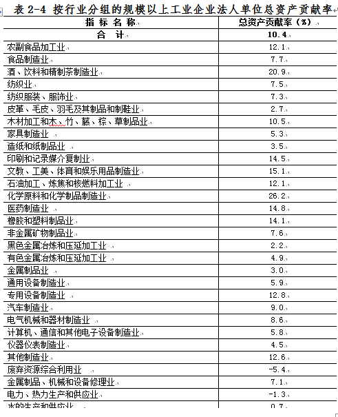 2013年,规模以上工业企业法人单位总资产贡献率为10.4%。其中制造业为10.9%,电力、热力、燃气及水生产和供应业为0.4%(详见表2-4)。