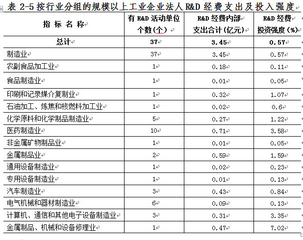 2013年,规模以上工业企业法人单位R&D人员折合全时当量1052人年。R&D经费支出3.45亿元;R&D经费投入强度为0.51%。规模以上工业企业法人单位分行业R&D经费支出及投入强度情况(详见表2-5)。