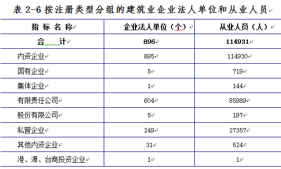建筑业企业法人单位从业人员中,内资企业占99.9%。内资企业中,国有企业占企业法人单位从业人员的0.6%,集体企业占0.1%,私营企业占23.8%(详见表2-6)。