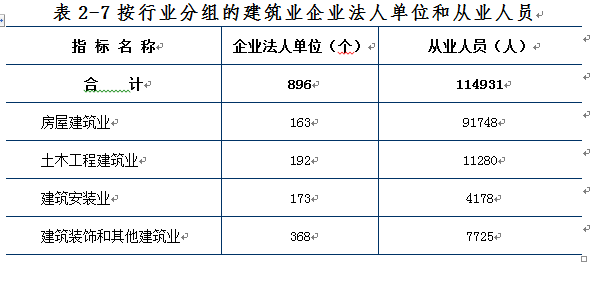 2013年末,全区共有建筑业企业法人单位896个,从业人员114931人,分别比2008年末增长126.8%和99.2%。