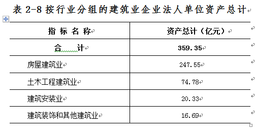 2013年末,建筑业企业法人单位资产总计359.35亿元,其中:房屋建筑业占68.9%,土木工程建筑业占20.8%,建筑安装业占5.7%,建筑装饰和其他建筑业占4.6%(详见表2-8)。