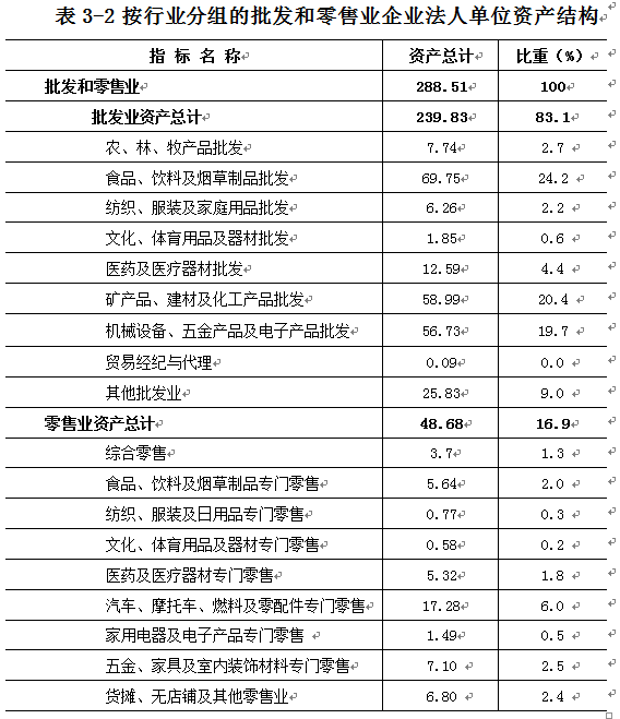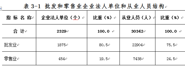 在批发和零售业企业法人单位中,批发业占80.5%,零售业占19.5%。在批发和零售业企业法人单位从业人员中,批发业占75.5%,零售业占24.5%(详见表3-1)。