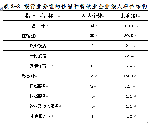 在住宿和餐饮业企业法人单位中,住宿业占30.9%,餐饮业占69.1%。在住宿和餐饮业企业法人单位从业人员中,住宿业占19.8%,餐饮业占80.2%(详见表3-3)。