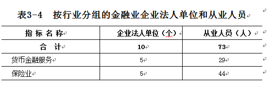 2013年末,全区共有金融业企业法人单位 10 个,从业人员73人(详见表3-4)。
