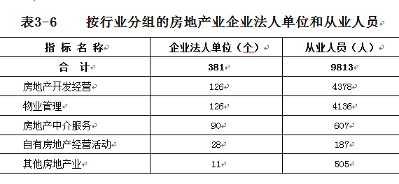 2013年末,全区房地产业企业法人单位的从业人员为9813人,比2008年末增长42.4%。其中,房地产开发经营企业4378人,物业管理企业4136人,房地产中介服务企业607人,分别比2008年末增长61.5%、15.6%和76.5%(详见表3-6)。