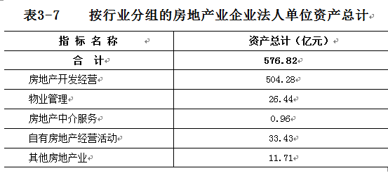 2013年末,全区房地产业企业法人单位的资产总计为576.82亿元。其中,房地产开发企业504.28亿元,物业管理企业26.44亿元,房地产中介服务企业0.96亿元(详见表3-7)。