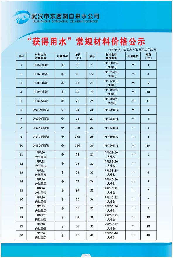 自来水公司获得用水维修材料价格公示